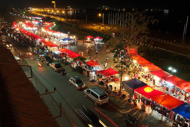 يقع السوق الليلي النابض بالحياة على طول نهر ميكونغ الذي يفصل فينتيان عن تايلاند