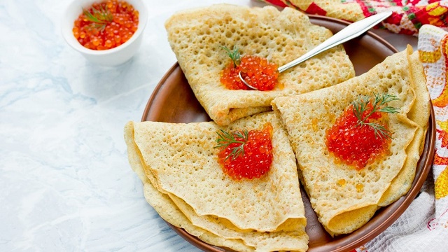 الطعام : مثل البليني “فطائر روسية رقيقة جدًا” حلوة وحادقة بمختلف أنواع الحشوات. وبيلميني أو الزلابية المحشوة بثلاثة أنواع من اللحم المفروم ويتم تقديمها مع وعاء كبير من القشطة الحامضية. وبيف ستروجانوف، وسيرنيكي وهي نوع آخر من الفطائر المصنوعة من الكوارك. وكاشا أو عصيدة الحنطة السوداء ، التي تقدم مع الزبدة أو السكر أو الحليب المُكثف.